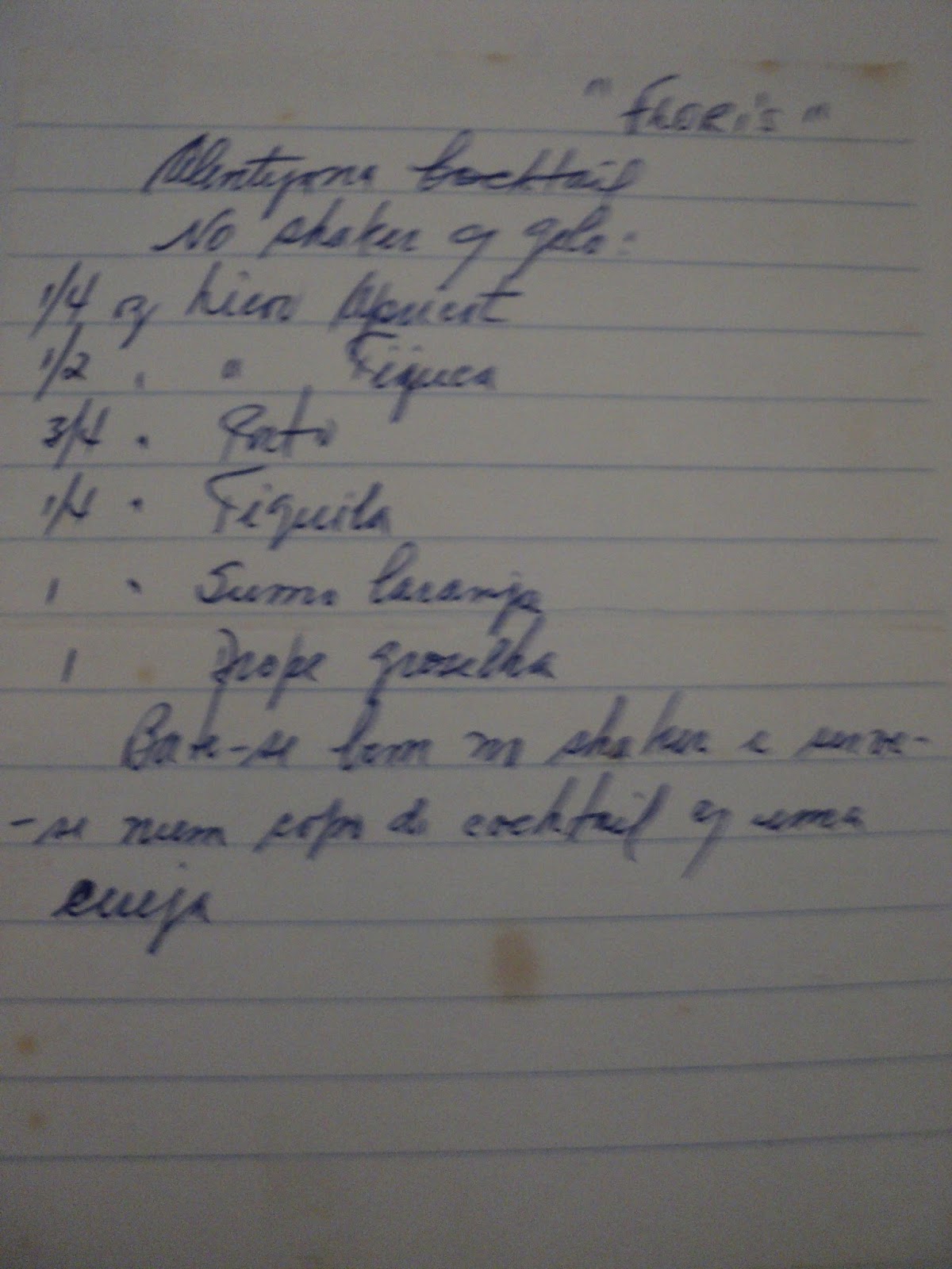 Vai-se lá saber porquê mas o Senhor Florisberto gostava de mim e decidiu honrar-me com um cocktail : Alentejana. Cocktail que beberiquei ao longo da minha estadia na ilha e se bem lembro era o preferido pelo grupo de amigos que percorria os mesmos passos. De forma solene ofereceu-me a receita antes de partir da ilha - inadvertidamente esqueci-o em casa do meu amigo que se interessou pela receita e a recriou. Pensei-o perdido e senti alguma mágoa. Reparto convosco a história e a receita:  Alentejana.
